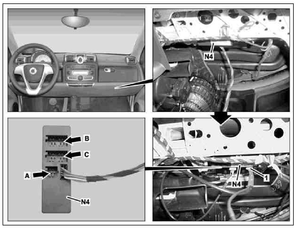 2 Attach connector (1) of retrofitted audio component to the communication control unit (N4).