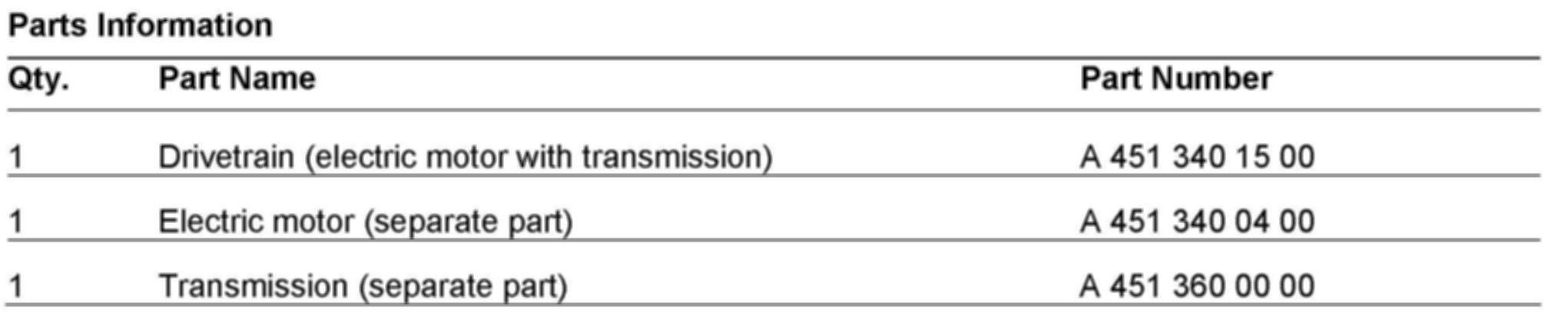 In individual cases, when ordering the electric motor (A 451 340 04 00), the entire electric drivetrain (electric motor with transmission) is supplied in assembled condition.