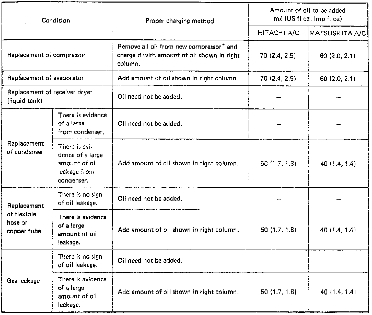When draining the evaporator and compressor, drain all oil out of the new compressor and then charge the compressor with the total amount of 140 ml (4.7 US fl oz, 4.9 Imp fl oz) oil [70 ml (2.4 US fl oz, 2.5 Imp fl oz) for the evaporator and [70 ml (2.4 US fl oz, 2.5 Imp fl oz) for compressor].