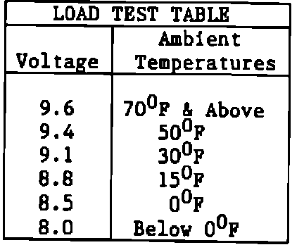 4) If voltage is less than table, replace battery. If equal to or greater, return battery to service.