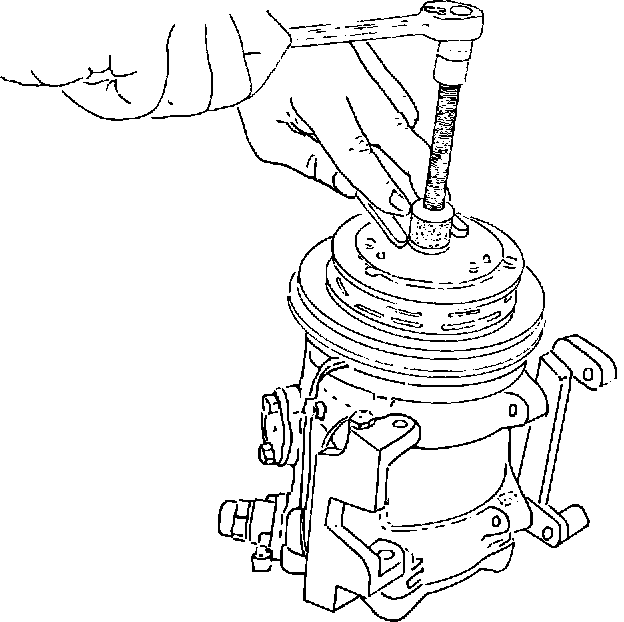 1.) Hold the clutch hub from turning with a clutch hub spanner wrench. (SOA 624 878 or equivalent). Remove compressor shaft nut. (See Figure 2)