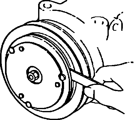 7) Using a plastic mallet, tap the new pulley and bearing assembly onto the nose of the compressor until seated. Install the snap ring with the flat side toward the pulley and bearing. Turn the pulley, making sure that there is no noise and that rotation is free.