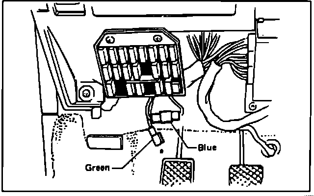 The EGR maintenance reminder indicator lamp will be illuminated to indicate time for EGR maintenance. After performing maintenance, reset reminder lamp. Remove instrument panel lower cover, then locate the three single pin electrical connectors located behind the fuse panel. Disconnect blue connector and connect it with green connector, Fig. 1.