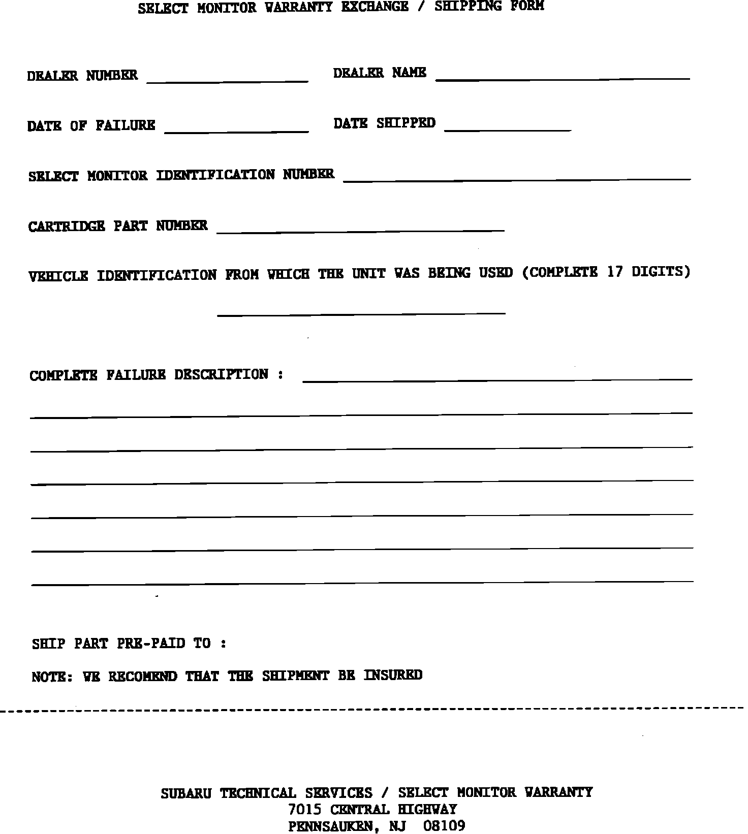 When a Select Monitor or cartridge has failed, the unit must be shipped pre-paid to Subaru of America. Upon receipt of the failed Select Monitor, Subaru of America will test the unit. If failed, Subaru of America will ship the dealer an exchange unit in its place and return the original unit to the manufacturer for further testing.