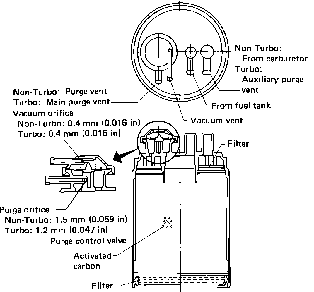 Fuel vapor evaporated from the fuel tank is routed into the canister located in the engine compartment. When the engine is idling, this vapor is stored in the canister because the purge valve on the canister is closed by the force of high intake vacuum. During this time, the vpaors are absorbed in the charcoal particles.