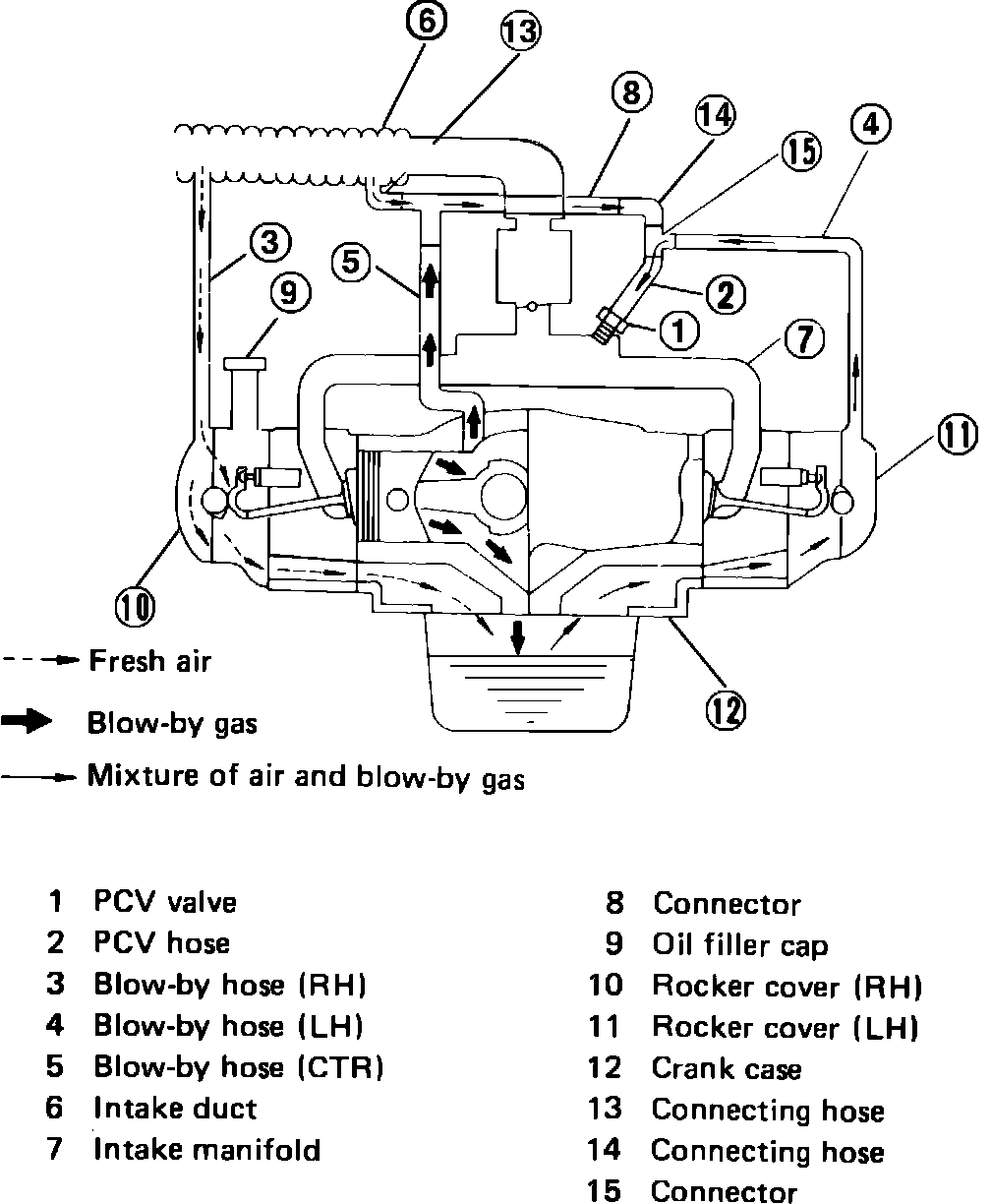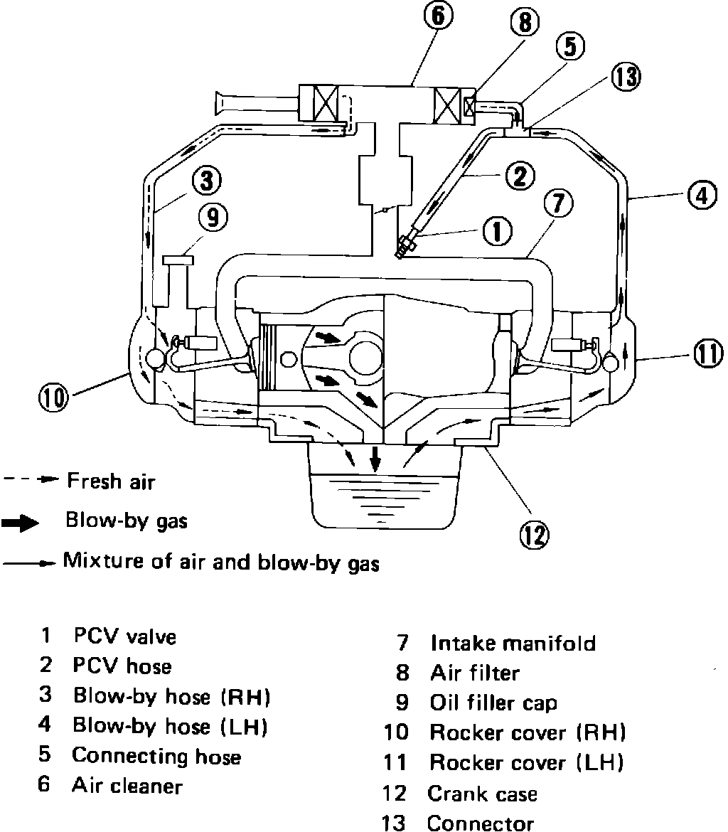 This system, FIGS. 1 and 2, prevents blow-by gases in the crankcase from escaping into the atmosphere. At part throttle operation, blow-by gases flow from the crankcase through connecting hose on cylinders 2-4 rocker cover to the PCV valve and then into the intake manifold. Ambiant air is drawn through the air cleaner and into the crankcase via connecting hose on cylinders 1-3 rocker cover. The ambiant air the mixes with the blow-by gases and enters the intake system.