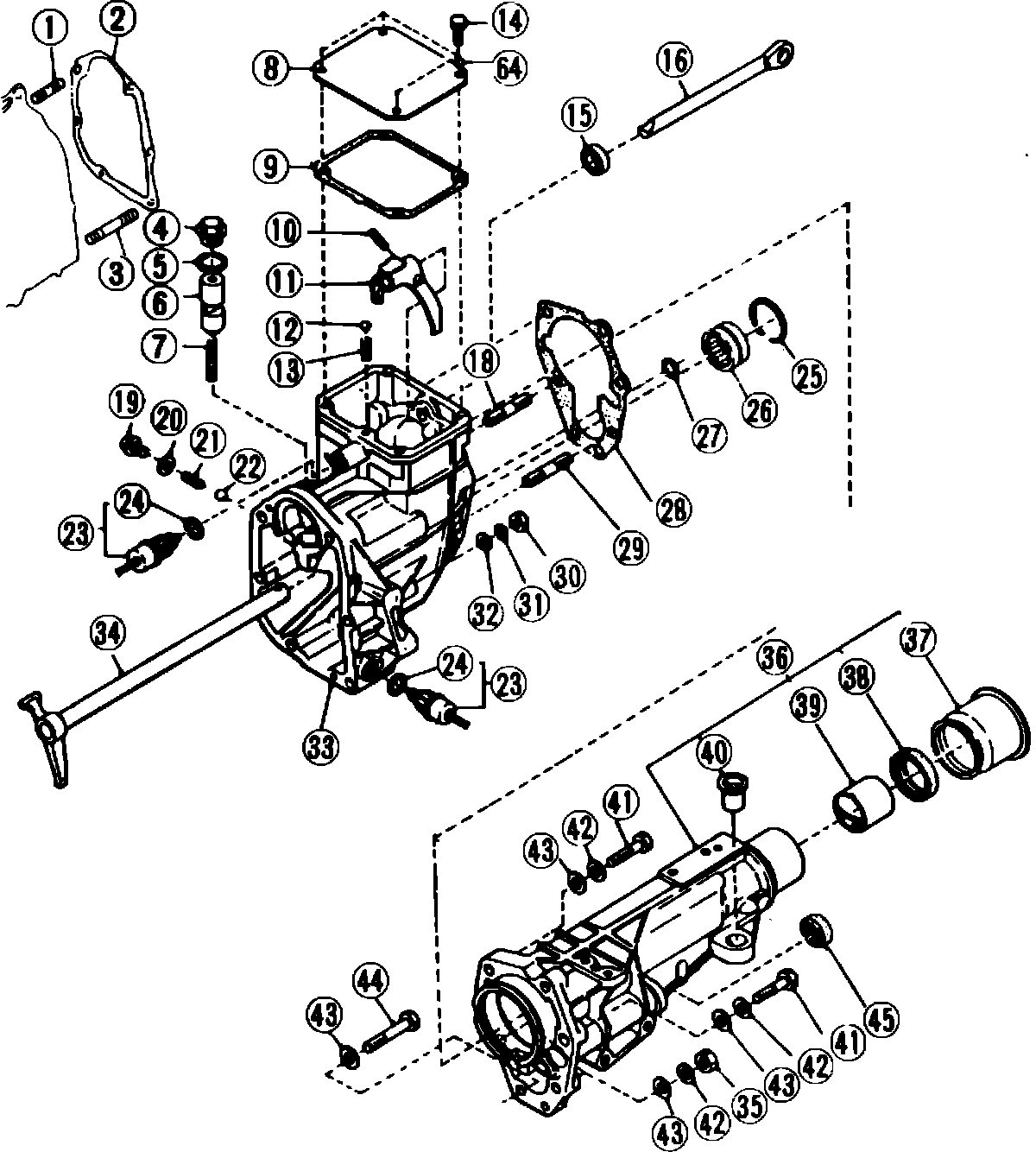 3. Install extension assembly with new transfer case rear gasket, then torque bolts to 27.5 ft.lbs. (3.8 kg-m). When installing, transfer drive and driven gears should engage each other.