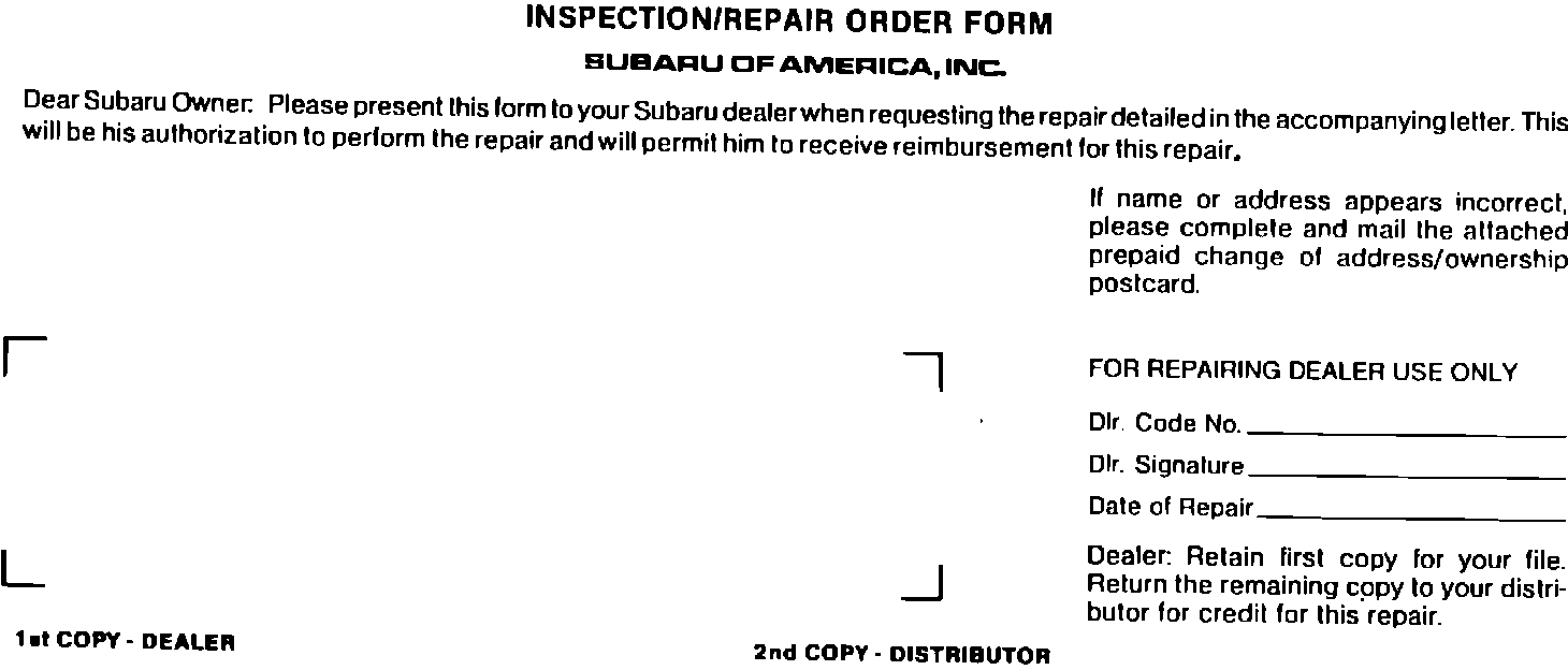 Please present the enclosed two-part Inspection/Repair Order Form to your Subaru dealer at the time this inspection is performed. If the form is misplaced, please contact the Customer Relations Department of the Subaru Distributor in your area at the address listed on the reverse side of this letter to obtain a new form. If you are no longer in possession of this vehicle, please complete the enclosed prepaid postcard and mail it to us so we may update our records.