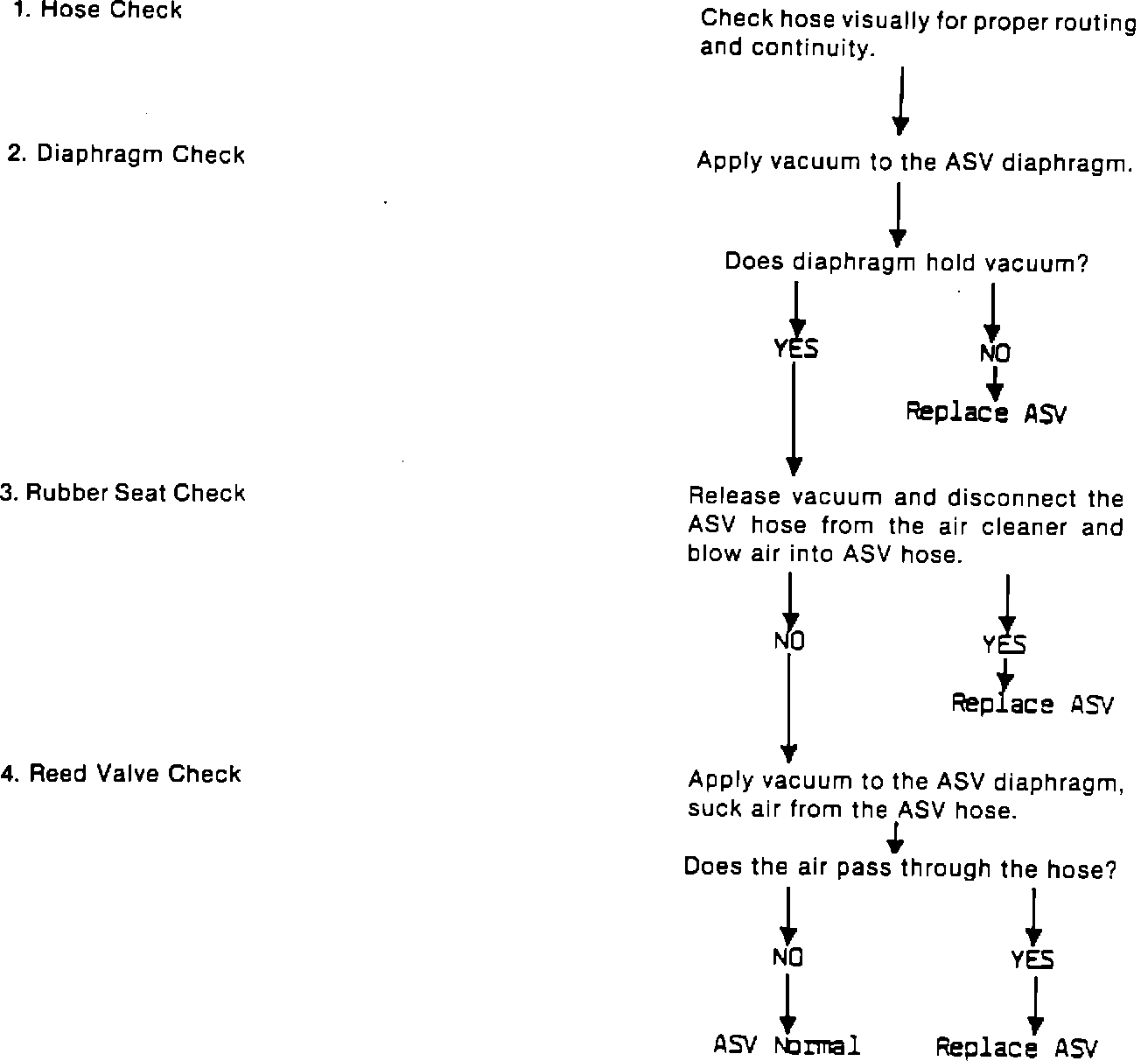 Reports of ASV failure have been received by SOA. Apparently, under some conditions, acid water may condense in the ASV causing failure. When the ASV fails, owners will experience driveability problems such as loss of power, rough idle, surge and excessive engine compartment noise during warm-up. SOA will replace any failed ASV with an improved valve at no cost to the owner. Any vehicle presented by an owner experiencing these conditions should be inspected and repaired, if necessary, following the flow chart in this bulletin.