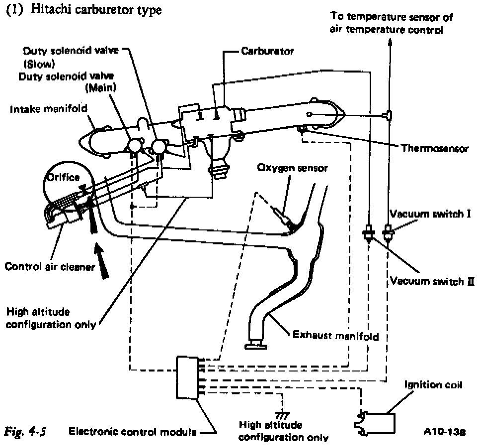 The 1982 Service Manual MSA-115 page 4-5, figure 4-3 (See Figure 1) and page 4-7, figure 4-5 (See Figure 2) shows an orifice located in the main duty solenoid source line for all Hitachi Carburetor equipped vehicles.