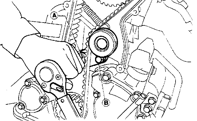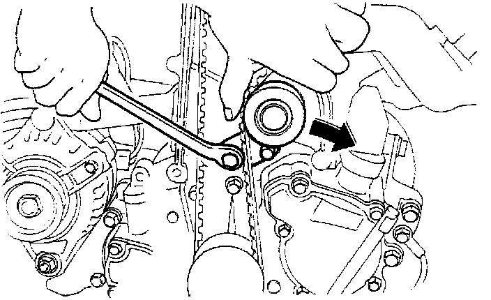 5) Loosen the bolts which secure the tensioner, and apply tension to the cam belt.