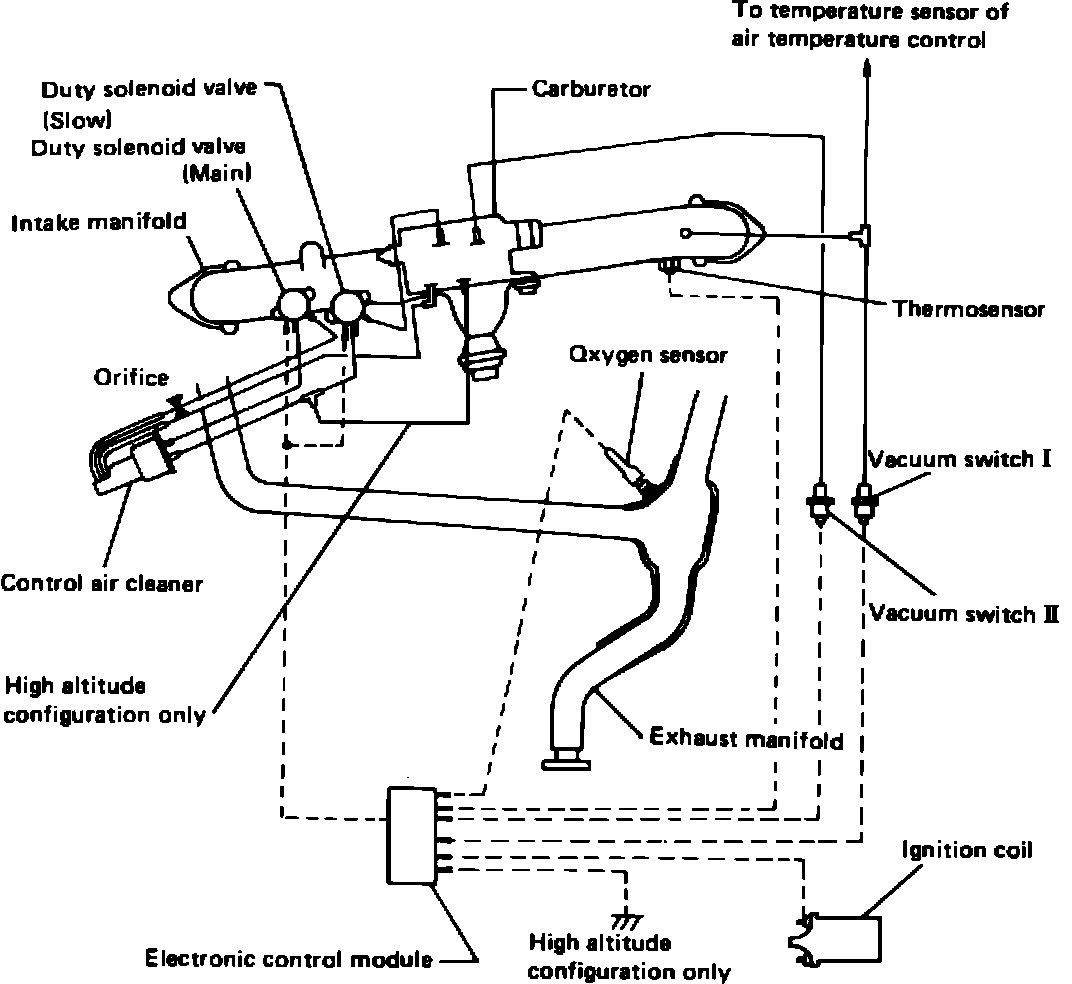The Electronically Controlled Carburetor System,Fig. 1 maintains the air/fuel ratio at nearly ideal conditions at all times, thereby controlling emissions while providing satisfactory driveability. The main components of this system are an oxygen sensor, electronic control module, duty solenoid valve, thermosensor, engine speed sensing circuit, and two vacuum switches.