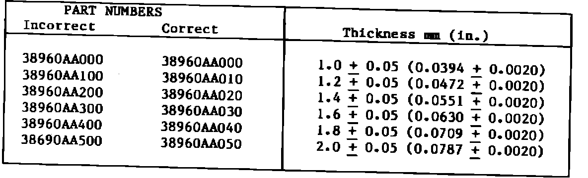 The 1987 Subaru service Manual section 3-1, pages 15 and 72, list incorrect part numbers for the center differential bevel washers. See Figure 1 for the correct part numbers.