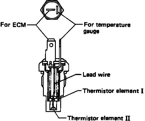 Installed on the intake manifold, the thermosensor monitors the temperature of the coolant and activates the temperature gage in the combination meter and sends a signal to the ECM for the Feedback control system. Completely sealed in a threaded case with an integral hexagon nut, it consists of a thermistor, lead wire, spring, and terminal plate.
