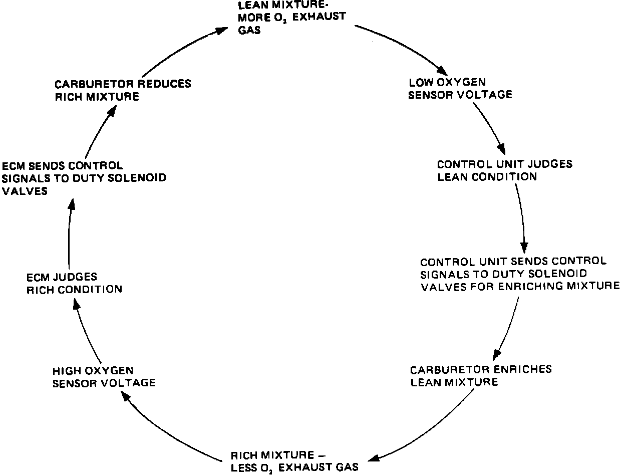 ^ Sending control signals to the carburetor duty solenoid valve to make mixture adjustments according to oxygen sensor output voltage and information input from various other sensors (feedback control).