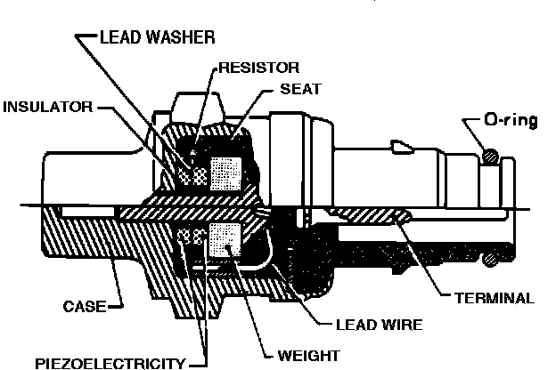 The sensor generates a signal whenever a vibration is sensed. When a knock occurs, the piezo-electric crystal (piezo element) in the sensor is compressed by the weight above it. The squeezing of the crystal, generates a low voltage signal readable by the ECU.