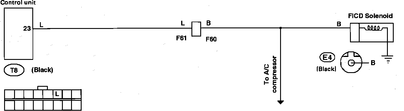 4. Using a voltmeter, confirm that battery voltage exists at the FICD connector E4. If voltage does not exist, check the wiring betwwen the solenoid and the A/C relay.