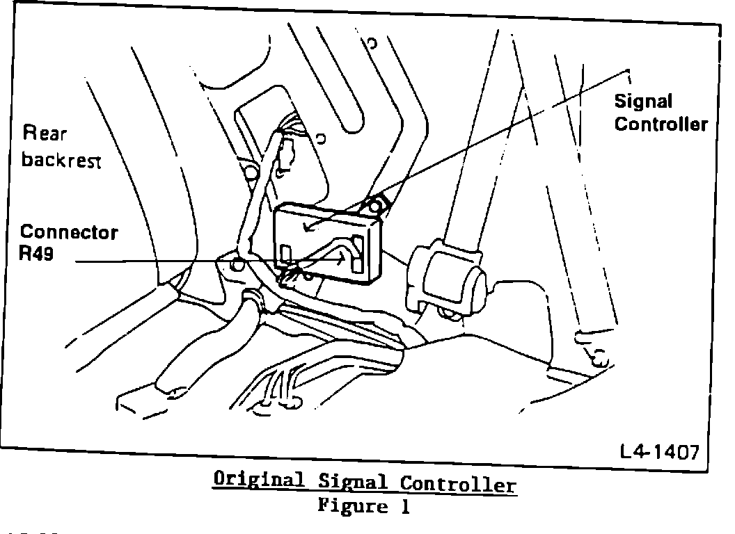 2. The signal controller is located inside the vehicle, behind the left side rear seat armrest trim panel mounted next to the automatic seat belt rail motor. Remove trim from this area as described in the applicable service manual to gain access. See Figure 1.