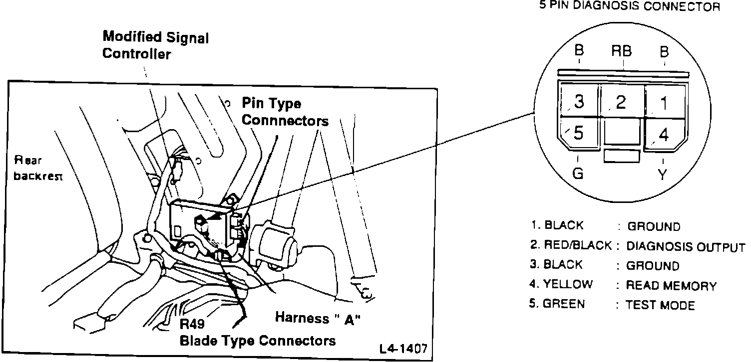 3. Remove the existing signal controller and replace with the modified unit. Note that harness "A" has several connectors. One of these is a 5 pin diagnostic connector that can be used for accessing diagnostic information. This connector doesn't get plugged into anything. The multi-pin blade type connector mates with OEM harness connector R49. The remaining pin type connectors should already be plugged into the modified signal controller. See Figure 2.