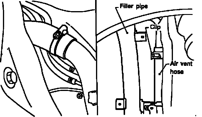 6. Remove clamps and disconnect fuel filler hose and air vent hose from fuel filler pipe.