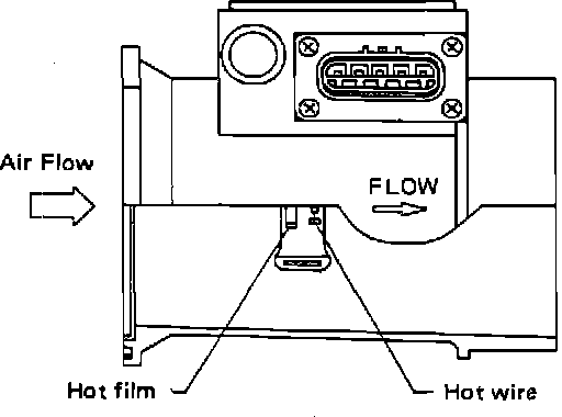 Whenever the ignition is ON, the sensor produces an output signal to the ECU. The hot-film sensing head acts as a temperature sensitive resistor. The ECU maintains the sensing head at a preset constant temperature. As air passes over the hot-film, it has a tendency to cool. Since the sensor head changes resistance based on temperature, a varying current is required to maintain constant temperature. The internal circuitry of the sensor monitors this changing current demand and sends a varying voltage output signal to the ECU, tracking current required.