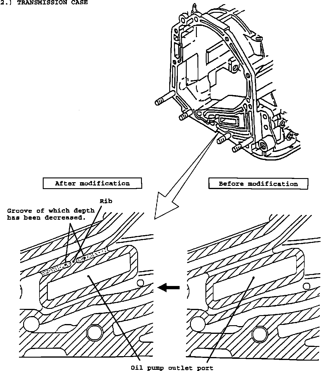 The transmission case was slightly modified starting with transmission number 426208. Modification was made to prevent oil pump gasket deterioration. Installation of the updated oil pump gasket is all that is necessary to prevent gasket deterioration on these earlier transmission.