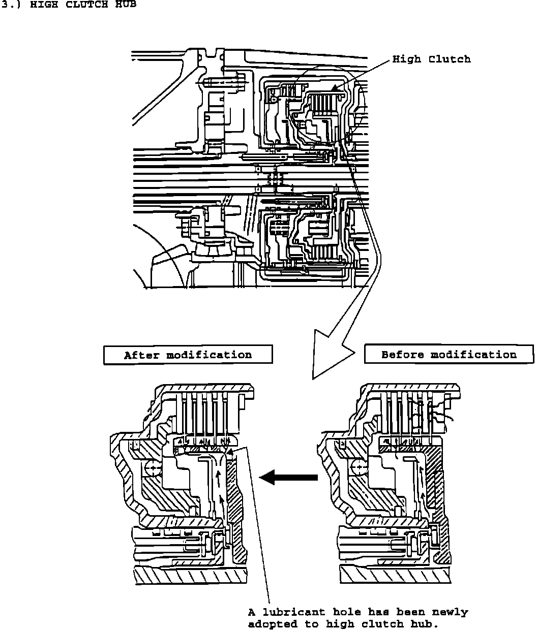 The modified high clutch hub has additional lubrication holes in it to provide required lubrication to the fifth clutch plate of the high clutch assembly. Recommended repair for a failed high clutch is replacement with the modified part(s) as applicable above.