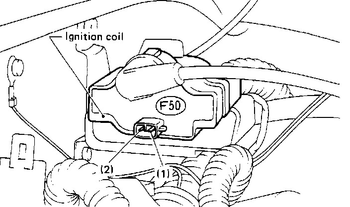 3. Measure resistance between coil high tension terminal and connector terminal (F50)1. It should read 10-14K Ohms @ 20° C (68° F).