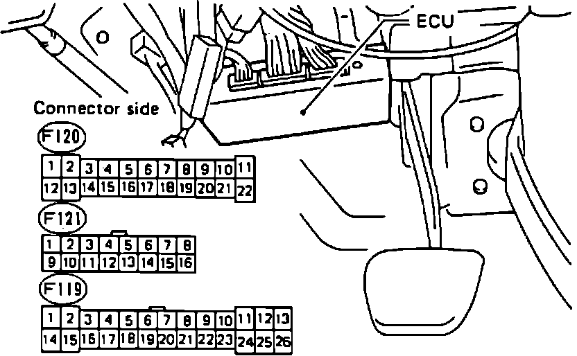 1. With ignition "ON," measure voltage between ECU connector terminal (F119)21 and ground while engine is being cranked.