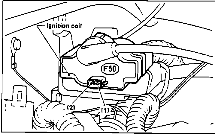 5. Measure resistance between coil high tension terminal and connector terminal (F50)1. It should read 10-14K Ohms @ 20° C (68° F).
