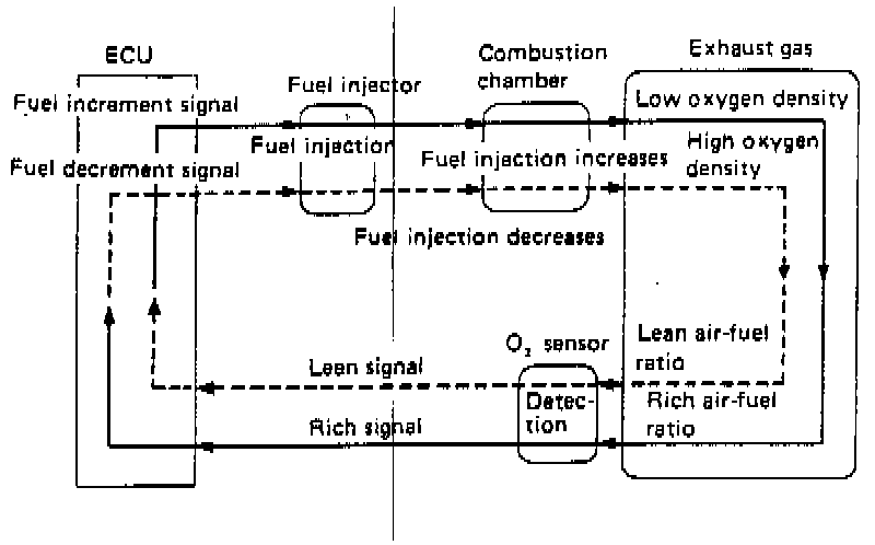This feedback coefficient utilizes the O2 sensor's electromotive force (voltage) as a signal to be entered into the ECU. When low voltage is entered, the ECU judges it as a lean mixture, and when high voltage is entered, it is judged as a rich mixture. In other words, when the air-fuel ratio is richer than the theoretical air-fuel ratio, the amount of fuel injected is decreased. When it is leaner, the amount of fuel injected is increased. In this way, the air-fuel ratio is compensated so that it comes as close to the theoretical air-fuel ratio as possible on which the three-way catalyst acts most effectively. (CO, HC and NOx are also reduced when the air4uel ratio is close to theoretical air-fuel ratio.)