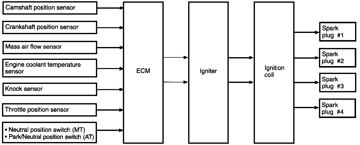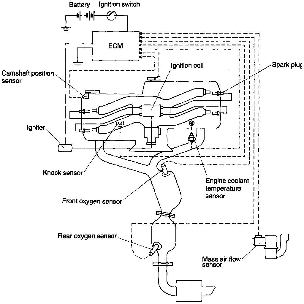 - The Engine Control Module (ECM) receives signals emitted from the mass air flow sensor, engine coolant temperature sensor, crankshaft position sensor, camshaft position sensor, etc., to judge the operating condition of the engine. it then selects the optimum ignition timing stored in the memory and immediately transmits a primary current "OFF" signal to the igniter to control the ignition timing.