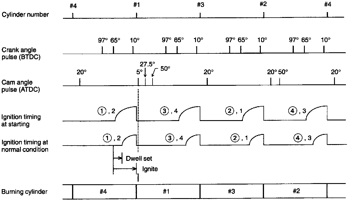 Engine speed fluctuate at the starting condition, so the ECM can not control the ignition timing. When such a condition exists, ignition timing is fixed at 10° BTDC by using the 10° signal.