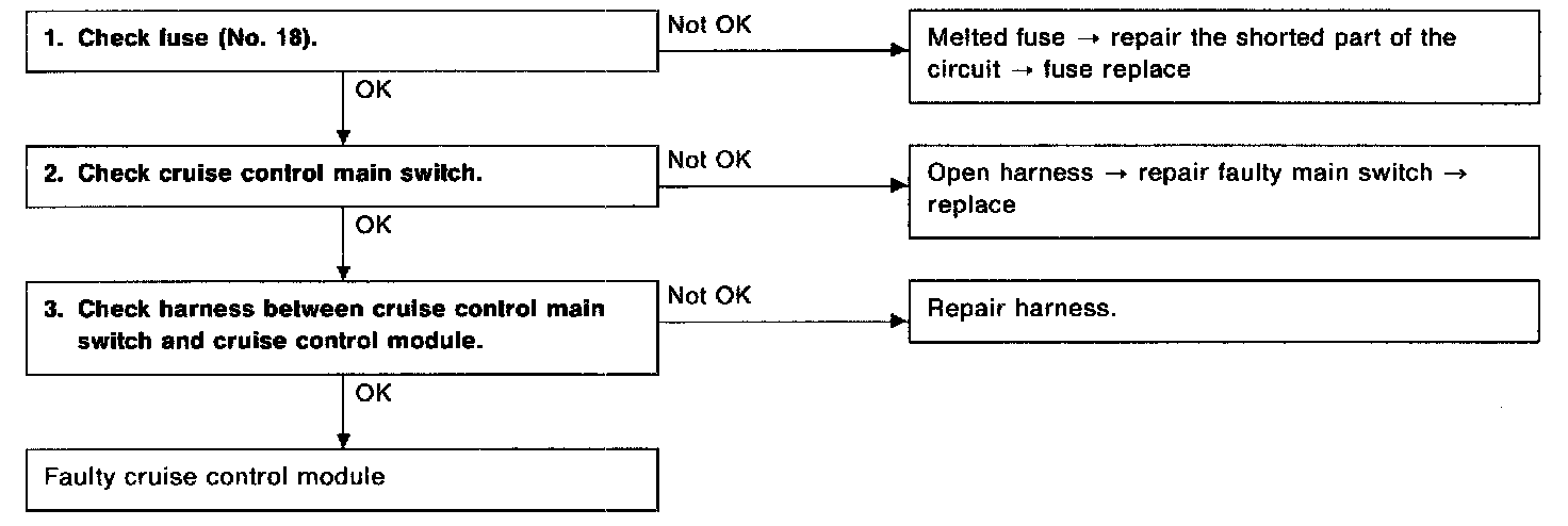 - Faulty cruise control main switch, or open harness.