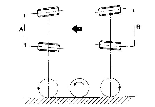 2) Mark rear sides of left and right tires at height corresponding to center of spindles and measure distance "B" between marks.