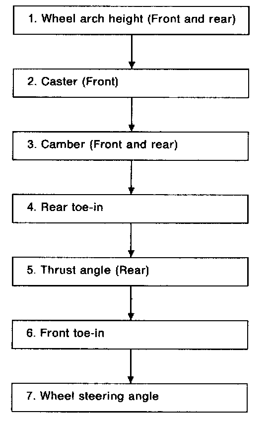 Check, adjust and/or measure wheel alignment in accordance with procedures indicated below: