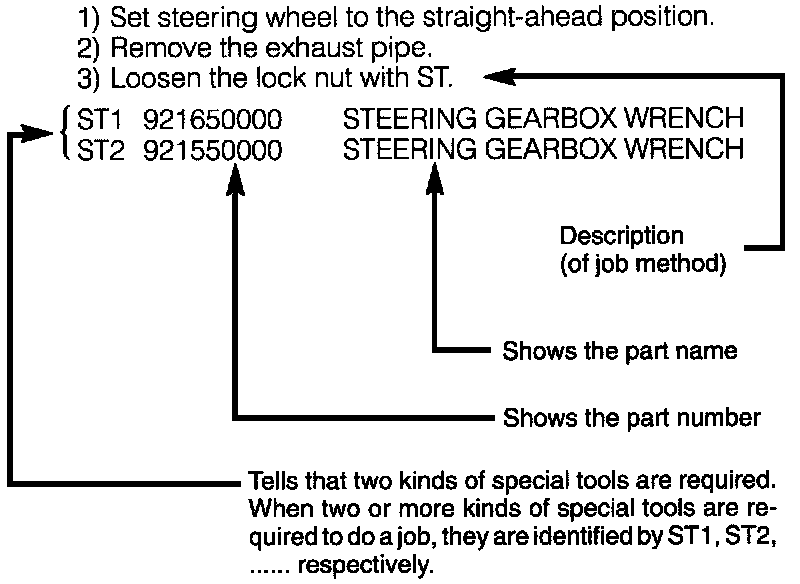 When any special tool is required to perform the job, it is identified by "ST" in the applicable illustration and its part number is shown.