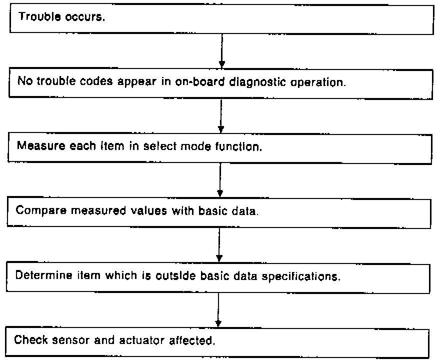 If no trouble codes appear in the on-board diagnostic operation (although problems have occurred or are occurring), measure performance characteristics of sensors, actuators, etc., in the "F" mode (Select Monitor function), and compare with the basic data to determine the cause of problems.