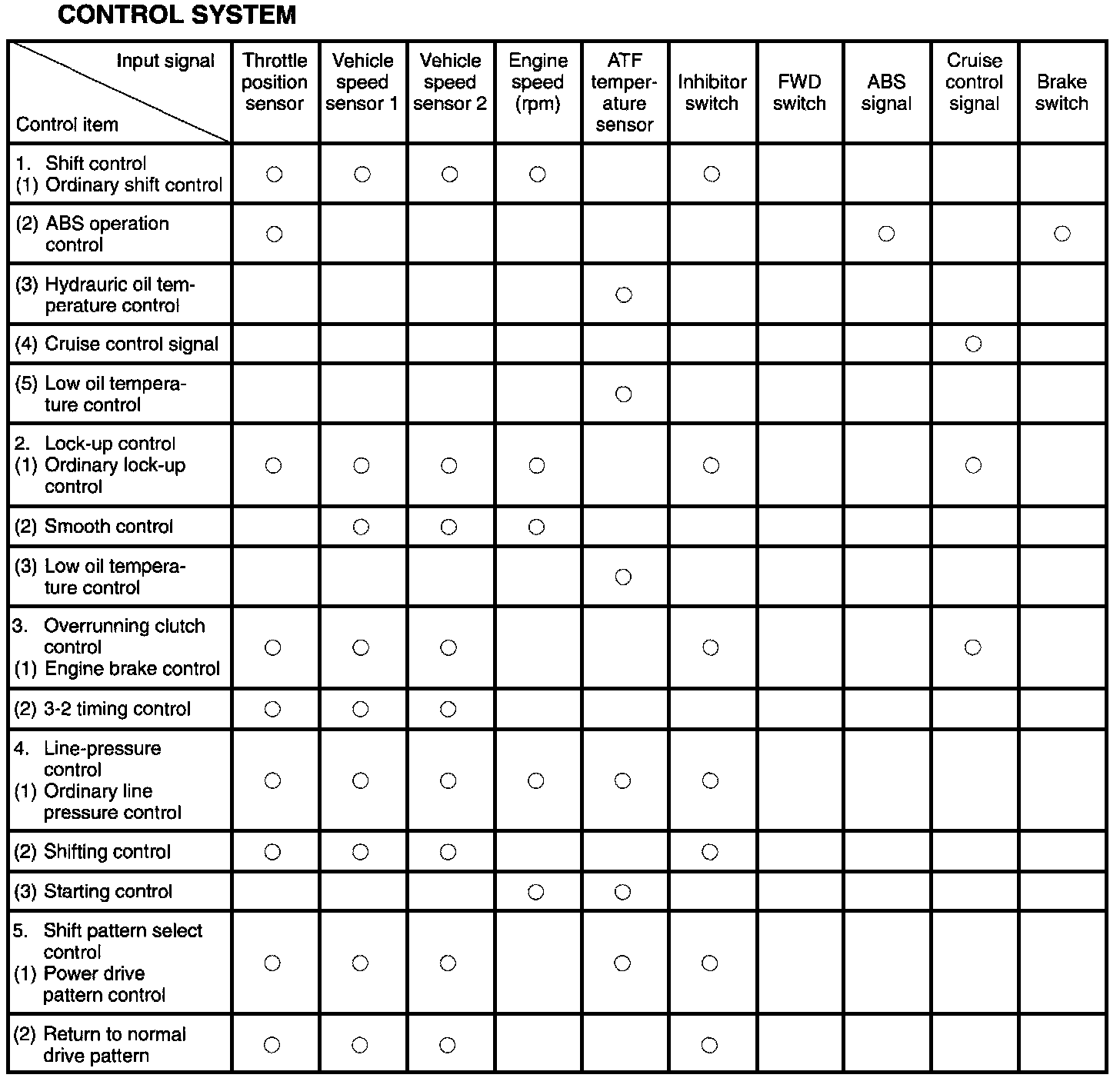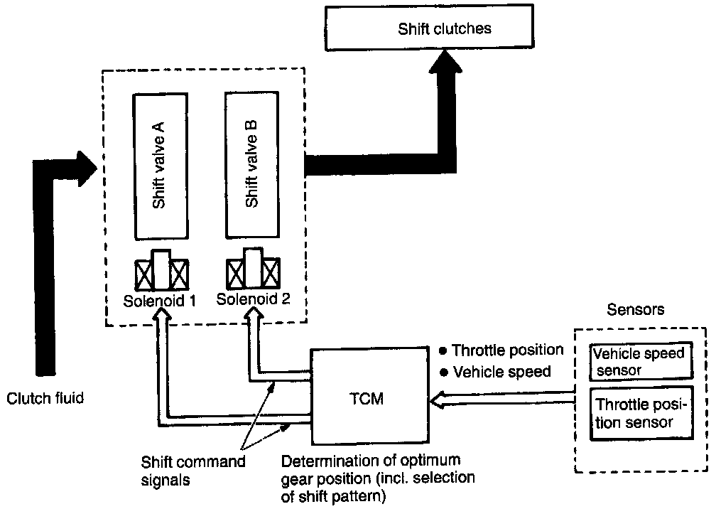 The Transmission Control Module (TCM) controls the shift solenoid corresponding to such input signals as throttle position, vehicle speed, shift range, and cruise control signals to automatically control the operation of the overrunning clutch and for positive application of engine brake.