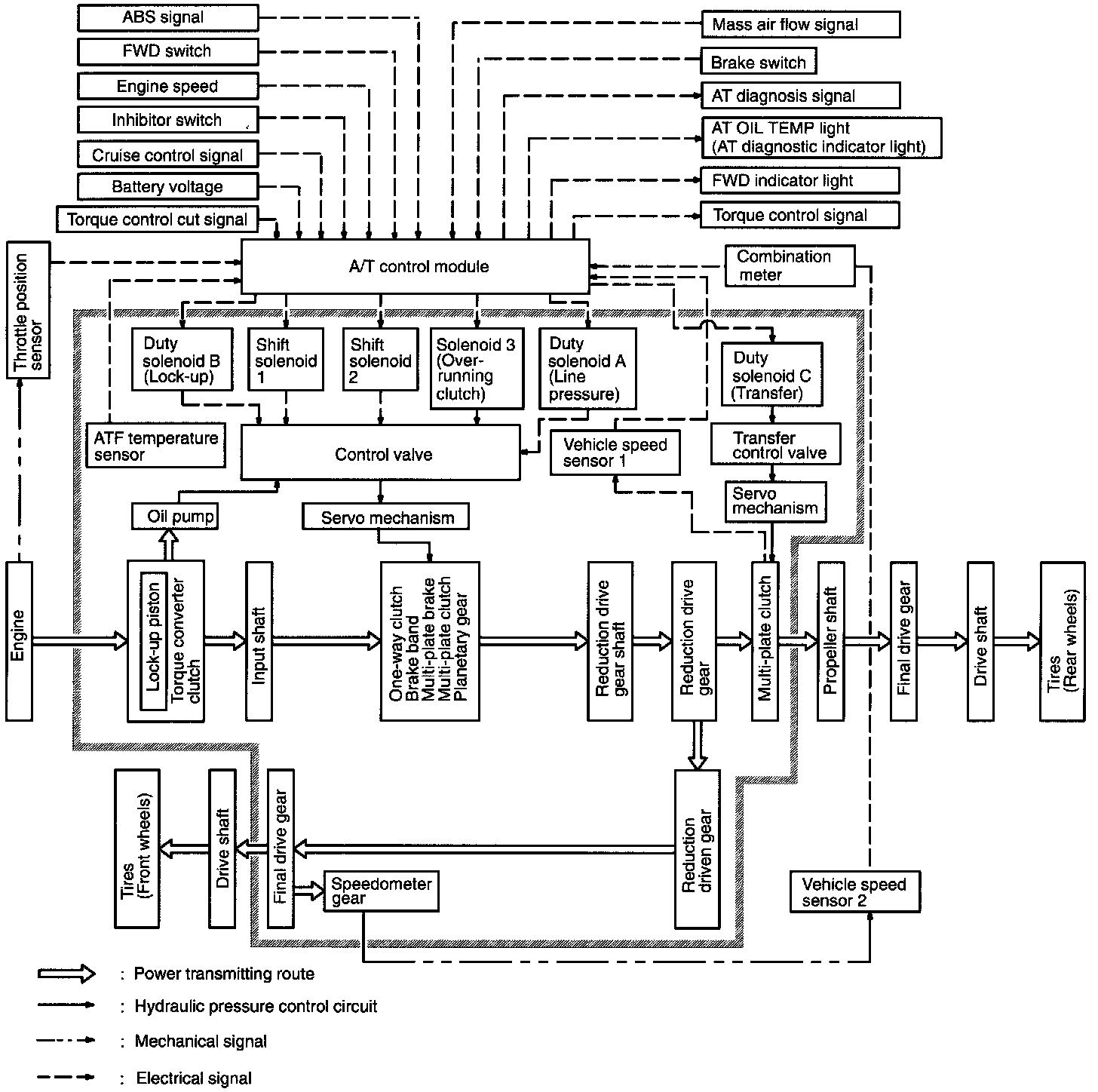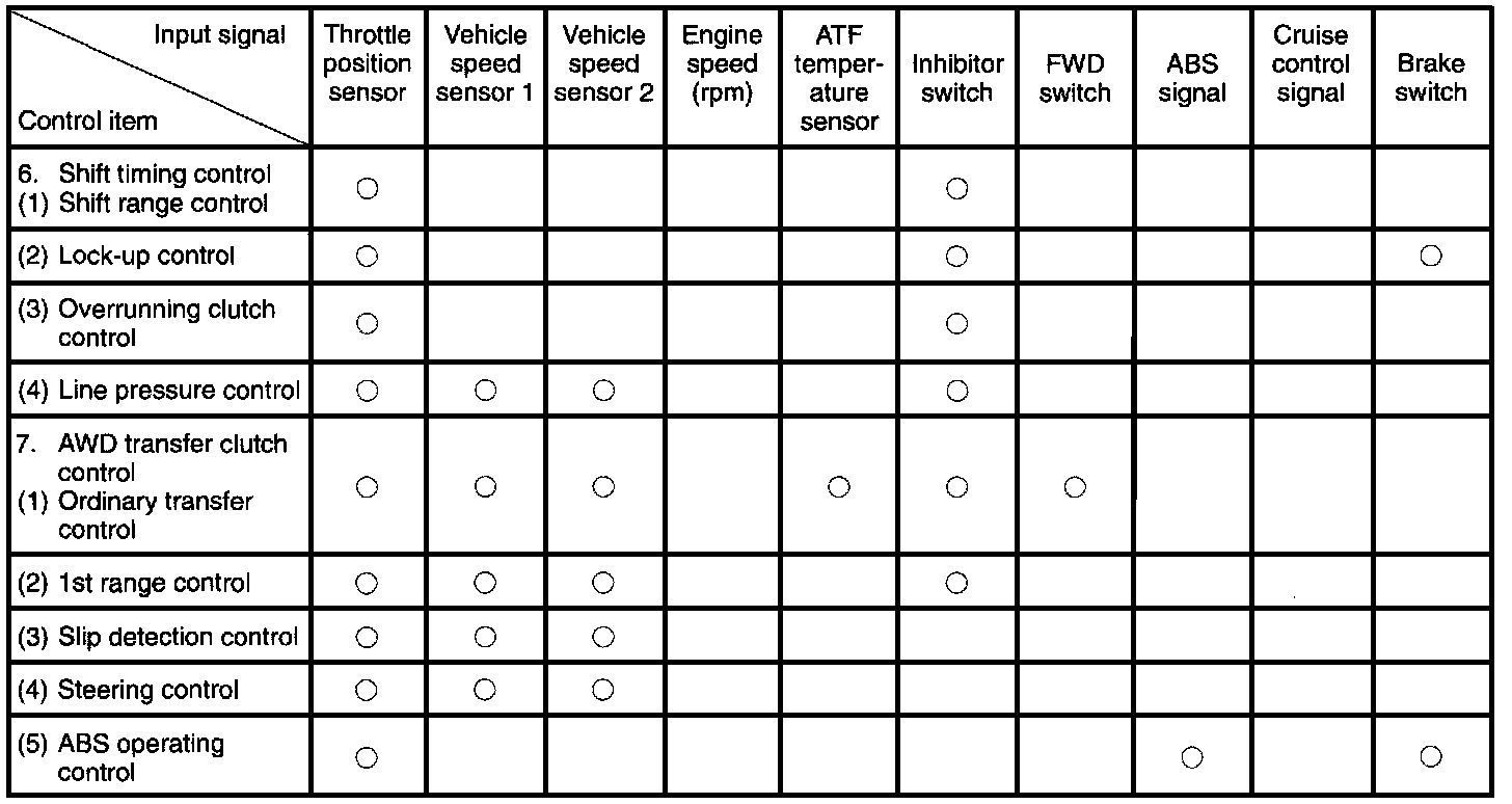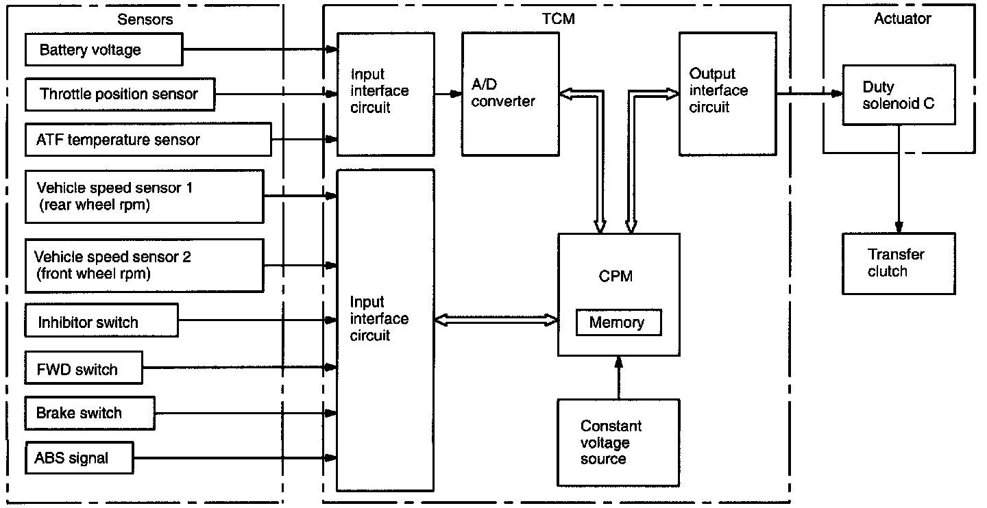 The Transmission Control Module (TCM) receives various sensor signals and determines the running conditions of the vehicle. It then sends control signals to each solenoid according to the preset gearshift characteristic data lockup operation data and transfer clutch torque data (duty ratio).