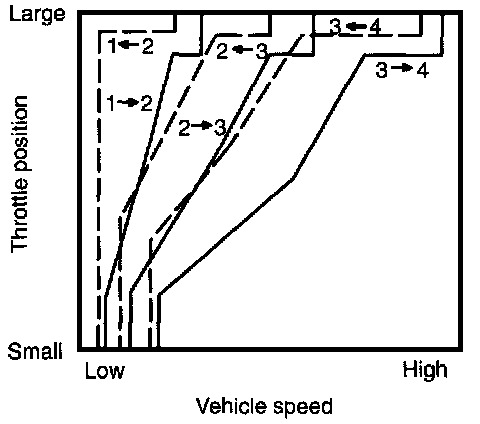 Gearshifting is controlled in response to driving conditions, according to the shift point characteristic data, as shown in the diagram, stored in the Transmission Control Module (TCM). Solenoids are operated at the proper time corresponding to the shift pattern, throttle position, and vehicle speed for smooth shifting.