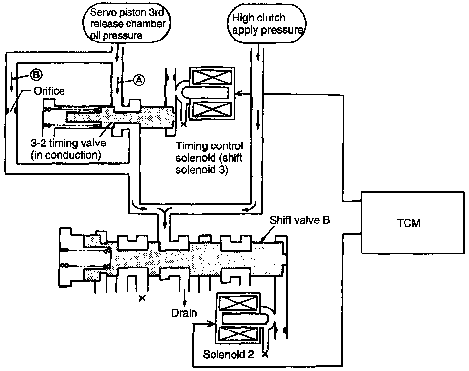 - When the 3-2 timing valve does not conduct, oil pressure applied to the 3rd release chamber is slowly released through passage (B) (provided with an orifice).