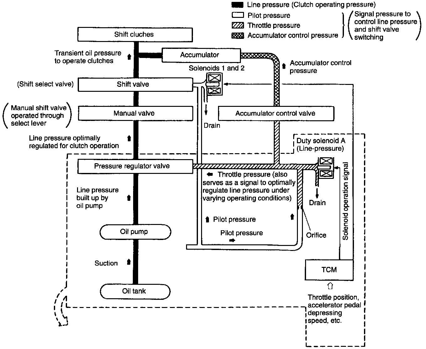 - Oil pressure which engages shift clutches (to provide 1st through 4th speeds) is electronically controlled to meet varying operating conditions. In other words, line pressure decreases to match the selected shift position, minimizing shifting shock.