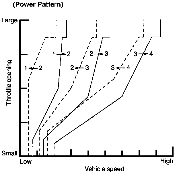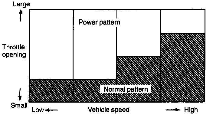 The power pattern is shifted to the normal pattern, depending on car speed. Shifting to the normal pattern is determined by the throttle position as shown. Time lag in shifting is also determined by car speed. The maximum time lag is 3 seconds.