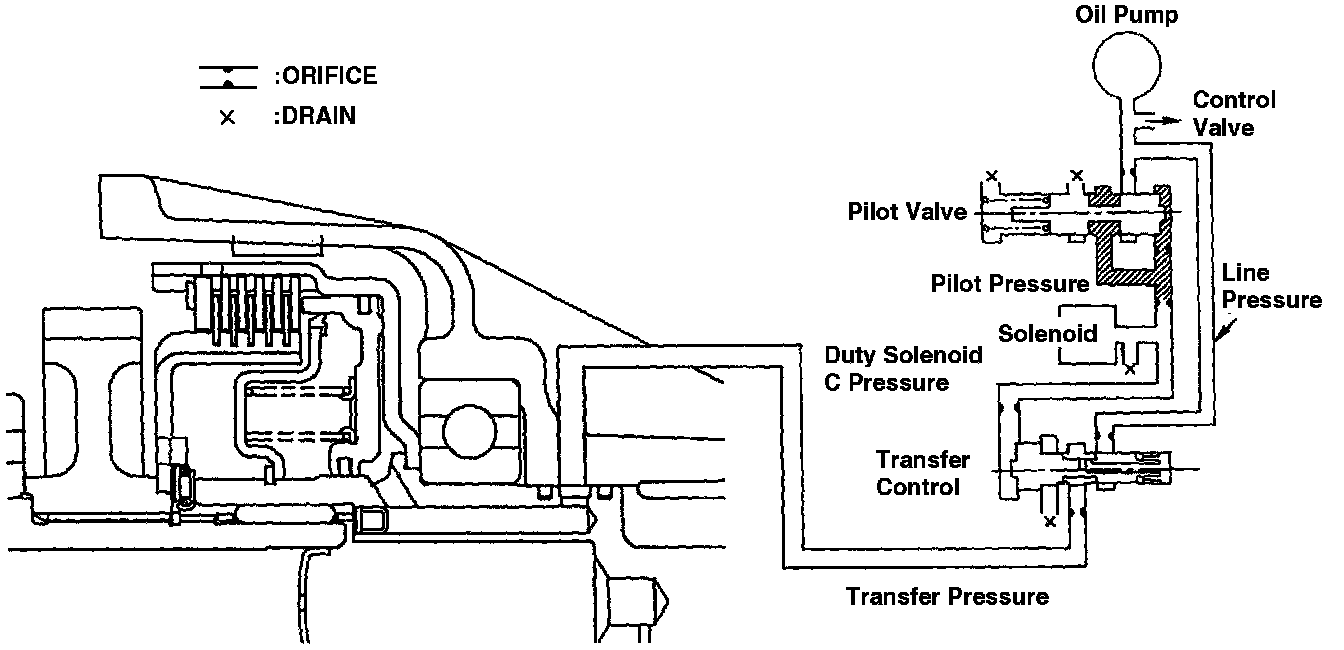 2. The pilot pressure is regulated to the transfer duty pressure by the duty solenoid c whose duty ratio is controlled by the Transmission Control Module (TCM) corresponding to the driving condition. (The transfer duty pressure varies with the degree of duty control.)
