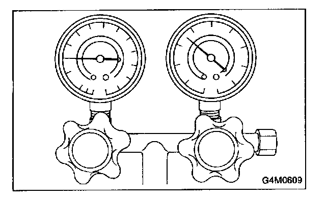1. With gauges connected to the A/C system, operate the A/C and confirm that the high side pressure is above 690 kPa (7.03 kg/sq.cm, 100 psi). If not, evacuate and charge the system before leak checking (refer to evacuation and charging).