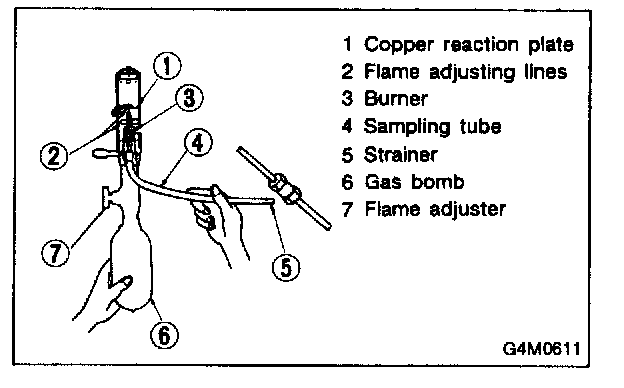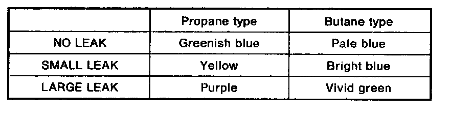 Since the propane leak detector and butane leak detector are the same in respect to their operation, this section describes the operation of the propane leak detector. The copper screen is heated by the burning of propane. Refrigerant gas decomposes to color the flame when it contacts the heated screen. The gas to be checked is drawn into the sampling tube and sent out to the burner. A refrigerant leak can clearly be detected by variations in the color of the flame.