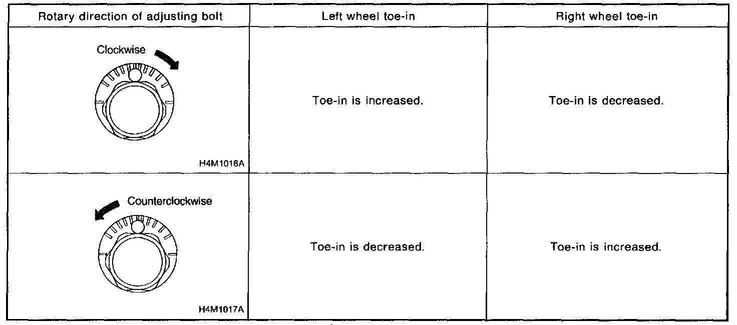 2) Turn adjusting bolt head until toe-in and -out are at the middle value of specifications.