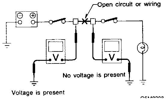 An open circuit is determined by measuring the voltage between respective connectors and ground using a voltmeter, starting with the connector closest to the power supply. The power supply must be turned ON so that current flows in the circuit. If voltage is not present between a particular connector and ground, the circuit between that connector and the previous connector is open.