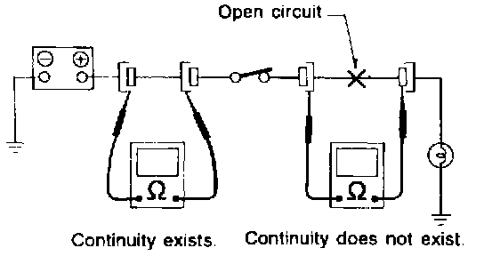 Disconnect all connectors affected, and check continuity in the wiring between adjacent connectors. When the ohmmeter indicates "infinite", the wiring is open.